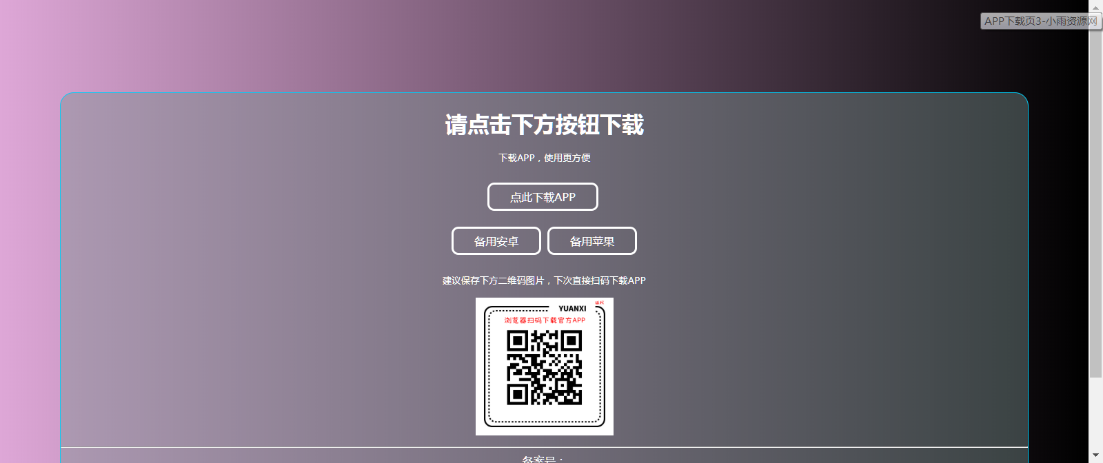 分享四款简洁好看. 自适应的 APP 下载单页源码,采用了底部自动获取 ICP 备案号,还有蓝奏云文件直链解析。不光可以做 APP 下载引导页,也可以随便改下按钮做网站引导页,自由发挥即可!蓝奏云直链解析的好处:APP 放在自己网站服务器里下载老是会报毒 (或 QQ 里老是报毒 APP 链接),但蓝奏云不会!而且蓝奏云速度快!(接口是远昔自己的,稳定俩年了)这四款单页的优点:自适应手机电脑,简洁好看,文件占用小,简单粗暴!