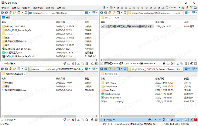Q-Dir可以使你更加方便地管理你的各种文件。Q-Dir将会同时显示4个Windows资源管理器的窗口,这样可以使你更加方便地对文件进行一些操作,例如复制,粘贴,浏览等等。此外Q-Dir 还可以对每个打开的资源管理器窗口分别进行配置,你可以用最舒服的方式浏览你的文件。