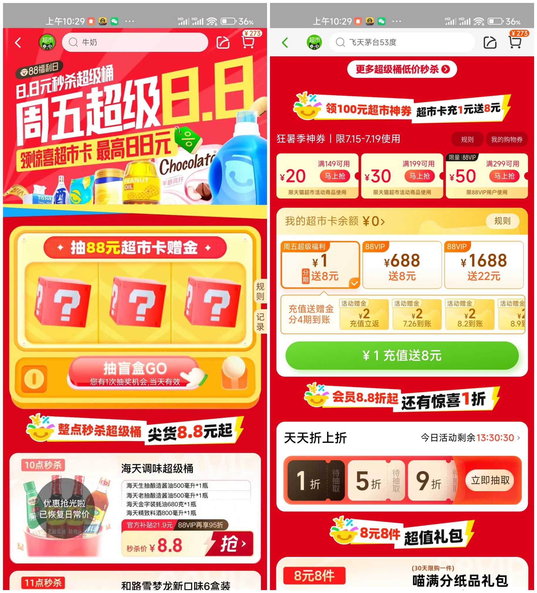 淘宝APP扫码->先抽最高88亓猫超卡->下拉88VIP有充1送8亓猫超卡!