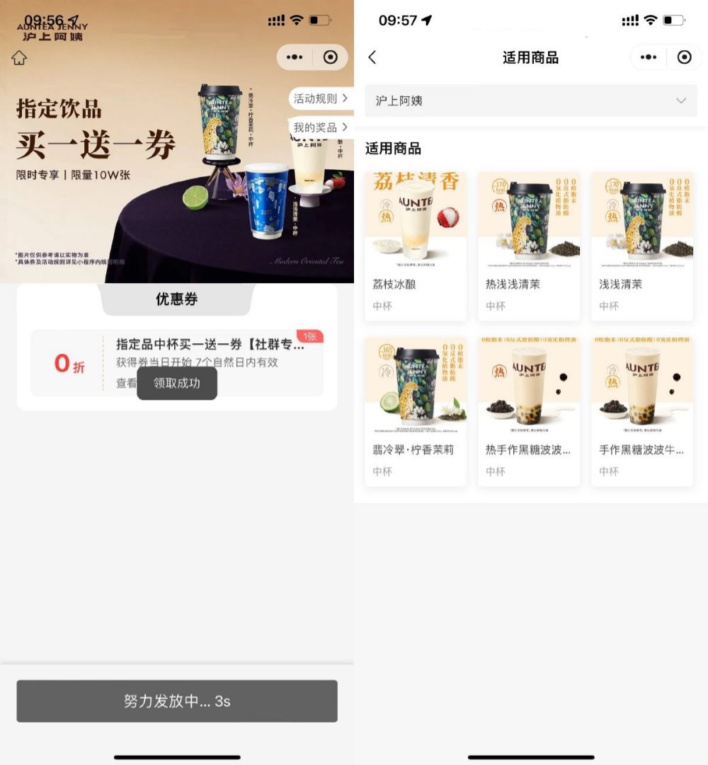 微信打开活动->直接领买一送一券 有7种饮品可用,限量10万张