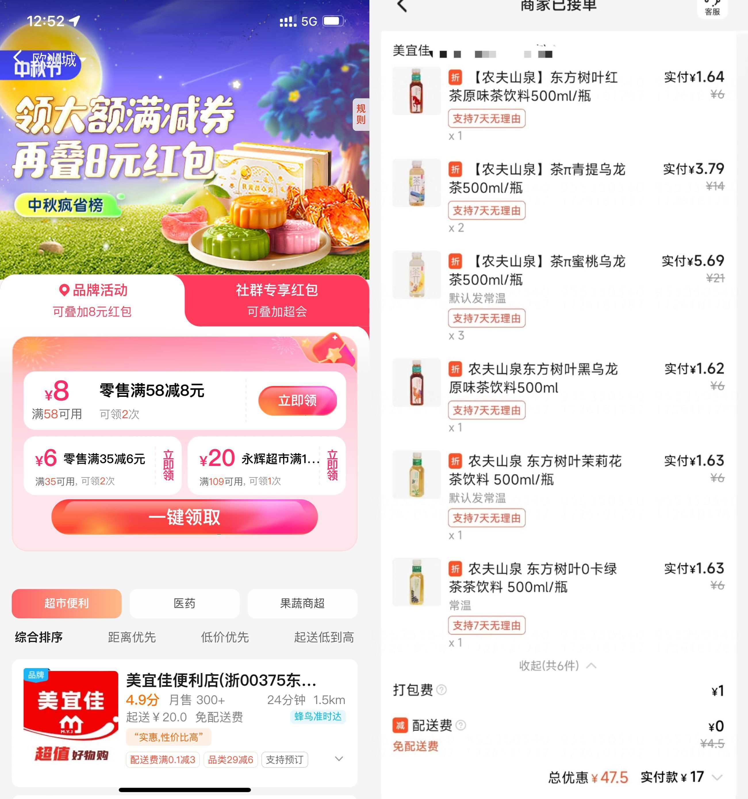 饿了么APP搜索“5200”->有58-8亓无门槛券,可叠加店铺满减和商品优惠,十几块撸一大堆实物