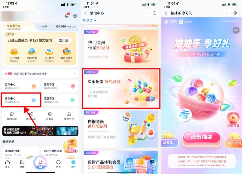 移动云盘APP底部“我的”->活动中心->欢乐扭蛋 好礼连连->每天无限次数抽立减金或视频会员周卡->累计4个视频会员碎片兑换月卡